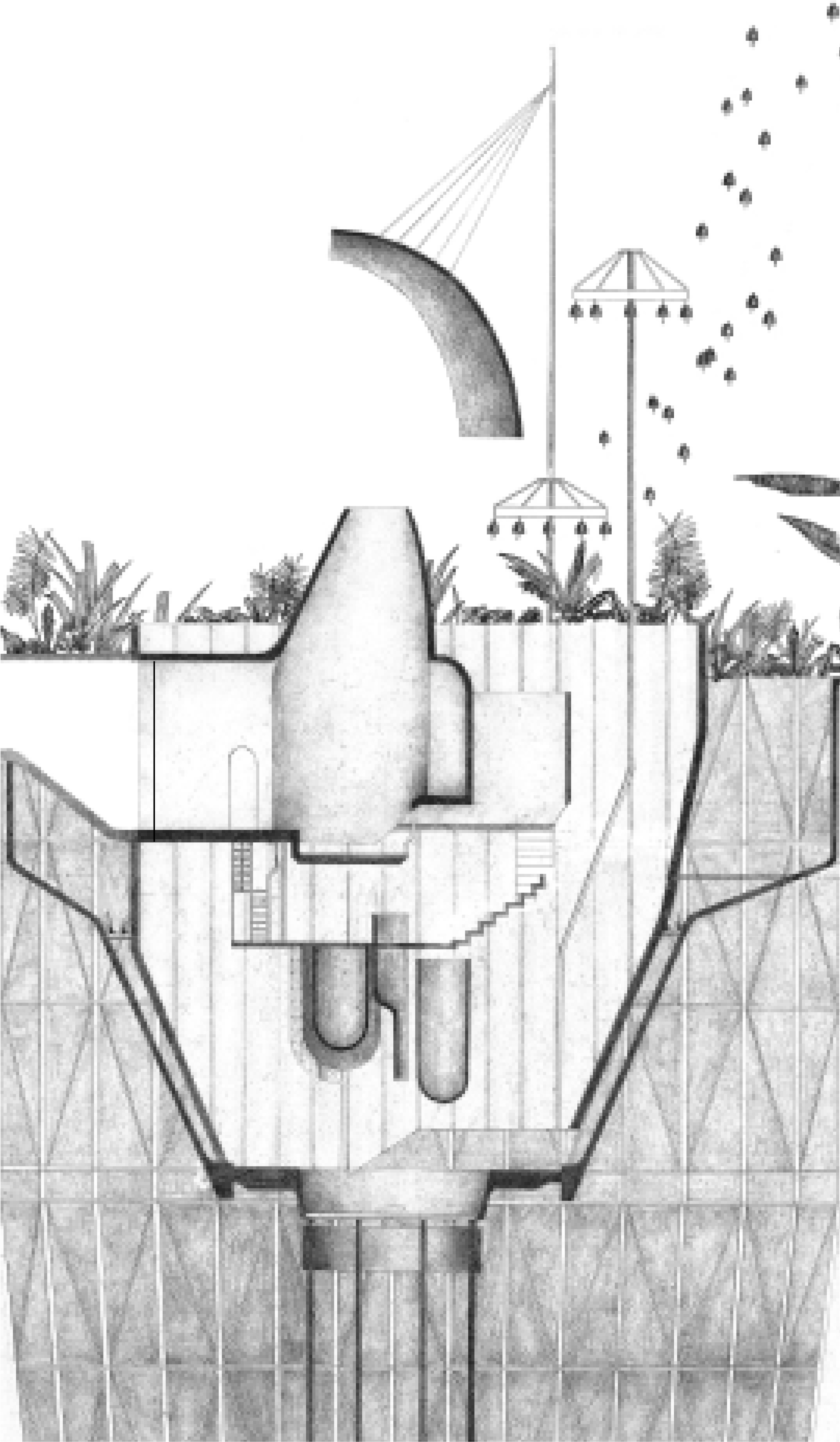 Mound Meru is a fictional architectural space where the future Boddhivista will be born through reincarnation, becoming a space for meditation and Buddhist retreat.